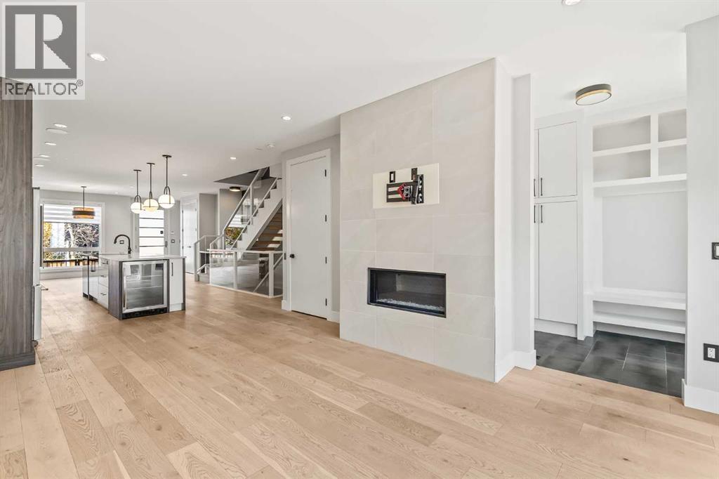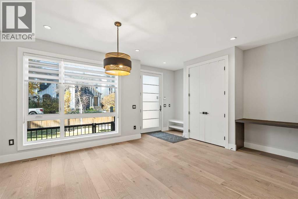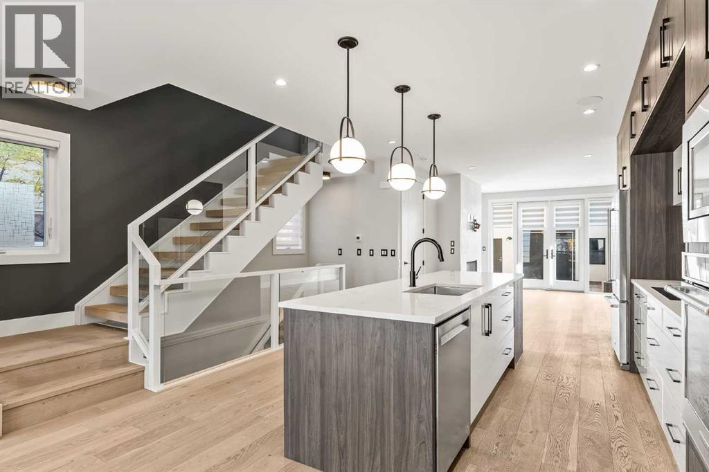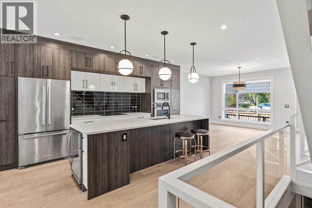 Proudly presenting 720 -15 St. NW. Wonderfully situated in the coveted community of Hillhurst, this 3,800 plus SF custom home presents like new while delivering an impressive list of upscale features including 5 bedrooms (2 primary bedrooms with ensuites), 5 bathrooms (2 steam showers), 2 laundry rooms, 2 fireplaces, a stunning open staircase & ELEVATOR! The bright main floor boasts a designer kitchen with extended cabinetry & pull-out pantry, stainless steel appliances with induction cooktop, beverage fridge, quartz countertops & a vast island with seating for 4. An oversized dining area easily accommodates large gatherings while the stylish living room with fireplace and glass doors opens seamlessly to the backyard. A chic powder room & practical mudroom with built-in storage complete this level. Upstairs, the striking open-riser staircase with glass panels leads to two full floors of hardwood-accented luxury living. The 2nd level is ideal for families offering two spacious secondary bedrooms with closet organizers & a beautifully upgraded 4-piece bath with heated floors. The 1st primary suite shares this level & is an excellent option for parents with young children. Featuring oversized windows, a custom walk-in closet & a spa-inspired ensuite with dual sink quartz vanity, freestanding tub, steam shower, & heated floors. A well-equipped laundry room with sink, quartz folding counter, & cabinetry adds convenience to this level. The 3rd floor is dedicated to refined living, highlighting a 2nd primary retreat with walk-in closet, lavish ensuite (dual quartz vanity, freestanding tub, steam shower, heated floors) & access to a sun-drenched private balcony overlooking the treetops. A spacious owner’s lounge with wet bar provides the perfect setting to relax, work from home, or enjoy quiet evenings. Completing this floor is a 2nd laundry room. The lower level brings family & friends together in a cozy family room with fireplace & a full wet bar with beverage fridge. A l arge 5th bedroom & 5th bathroom with heated floors round off this comfortable space. Other notable upgrades in this executive residence include a double insulated & drywalled garage with unique front & back doors allowing for additional parking, air conditioning, in-floor heating in ALL bathrooms, an elevator to age-in-place or accommodate multi-generational living, custom built-ins in ALL closet, a 75-gallon hot water tank, 200-amp electrical panel, built-in ceiling speakers & security system. Nestled just steps to parks, trendy restaurants, & the vibrant Kensington district, this luxury property offers a perfect balance of tranquillity & urban convenience. Its proximity to the Bow River, downtown, University of Calgary, SAIT & Foothills Hospital provides a remarkable location for work & play. With easy access to Memorial Drive & Crowchild Trail, this is a rare opportunity to own a magnificent property in one of Calgary’s most desirable neighbourhoods. (id:50315)